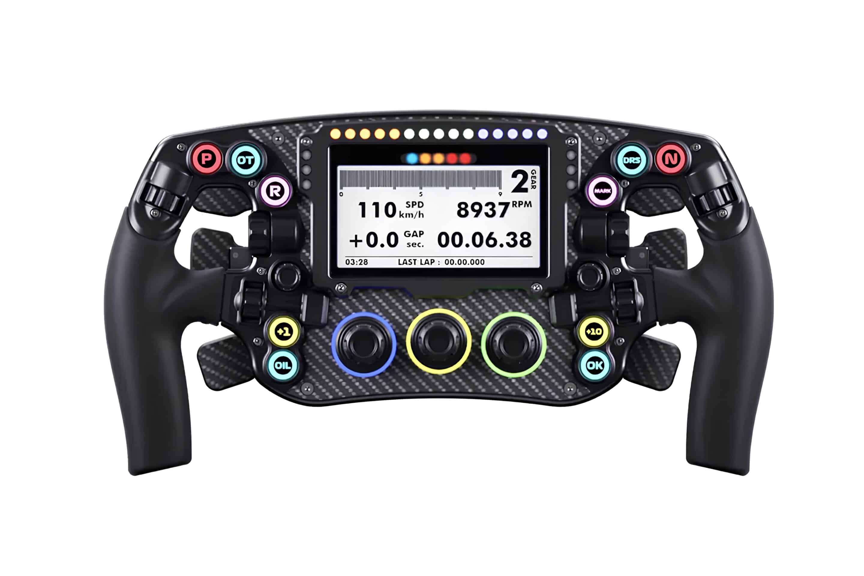 Si has visto antes productos LeoXZ, sus volantes son muy similares, y el XF1 no es una excepción. Es bastante sencillo en cuanto a diseño, con una placa frontal de fibra de carbono, empuñaduras de silicona, una pantalla central y botones RGB que debo decir que son discretos, y eso me gusta.