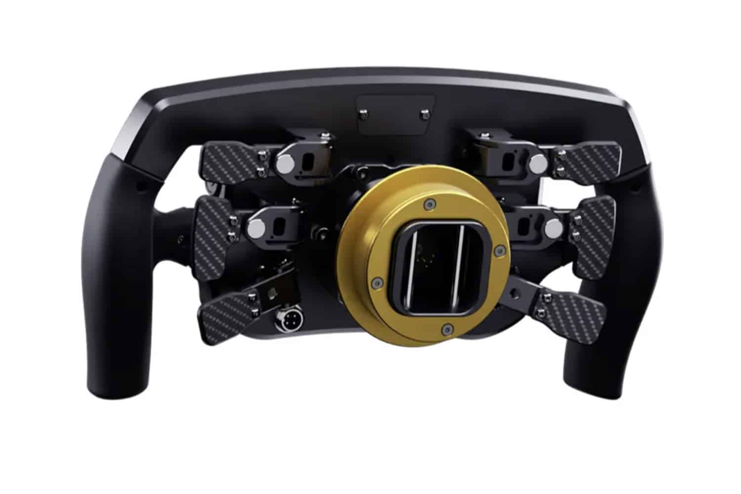 Con una forma rectangular y un diámetro de 29,5 cm, el XF1 es un volante fácil de agarrar. La posición de conducción es 9H15, con puños de silicona con revestimiento antideslizante y abiertos en la parte inferior.